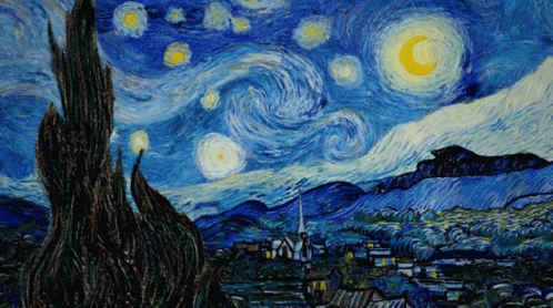 Kısaca ilgilendiğim eser hakkında kısa bir bilgi verecek olursam, Van Gogh, Yıldızlı Gece‘yi ölümünden sadece on üç ay önce 1889’da resmedildiği söyleniyor. Bu sırada Fransa’daki Saint-Remy’de bir akıl hastanesinde kalıyor ve şiddetli saldırıları nedeniyle davranışları özellikle düzensiz olduğu biliniyor. Yıldızlı Gece‘nin akıl hastanesindeki yatak odasının penceresinden manzarayı gösterdiğine inanılıyor. Tabloya dikkatlice baktığınız da aslında her çizginin belli bir döngüde çizildiği resmediliyor. Yukarıda ki GIF örneğinde gördüğünüz gibi… Beni de cezbeden bu eserin güzelliği…