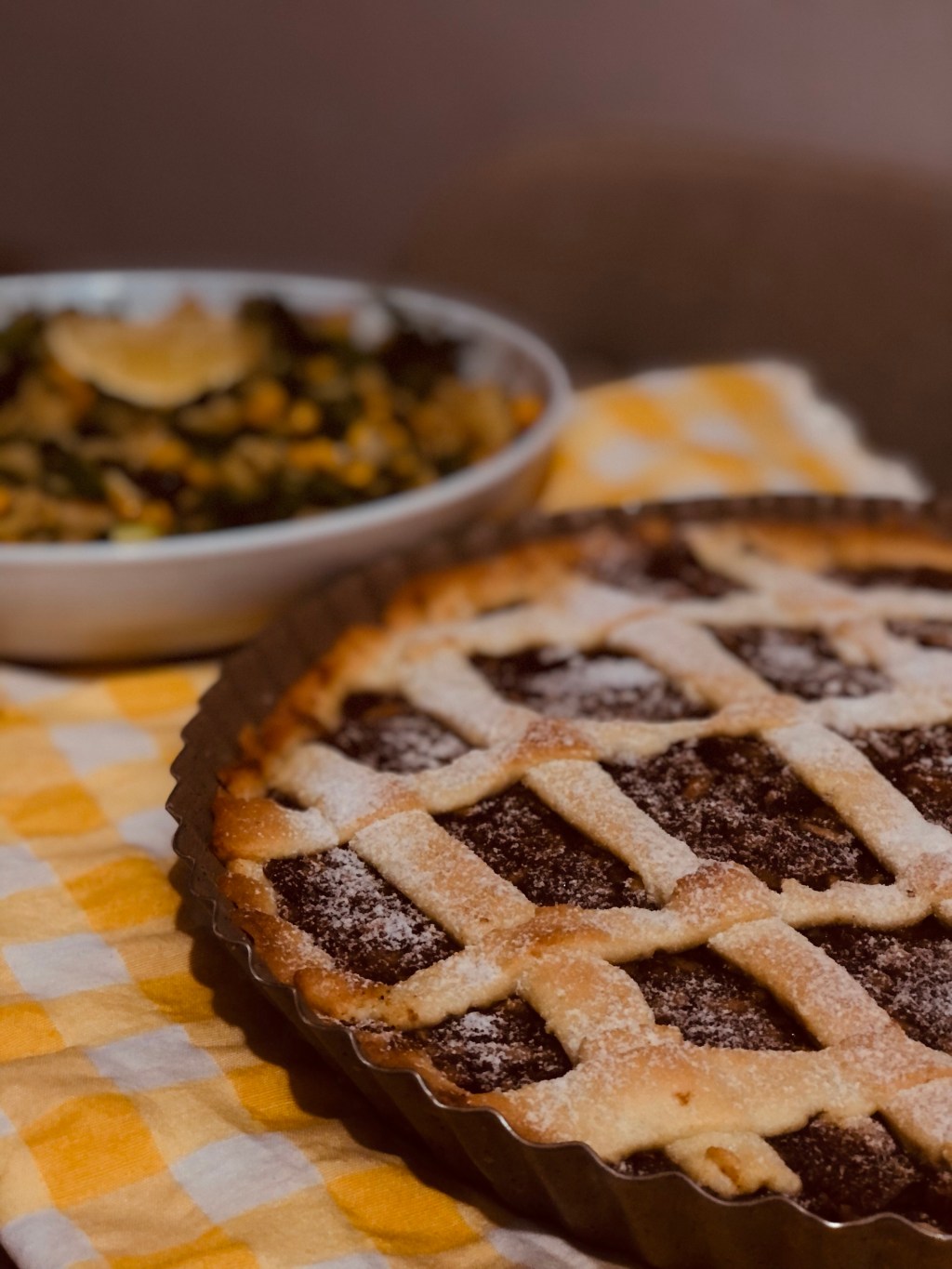5. Hamurun bir kısmını üst şeritleri için ayırın. Hamuru kabımıza yayın. Elma harcını hamurun üzerine yayın.